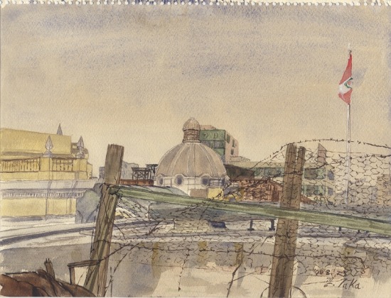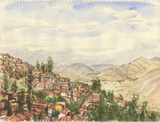 3朝連続の、宿屋上スケッチ。やはり霧雨が当たる。 隣の屋上にいつもの親父さんが現れて、ペルー国旗を掲げていった。宿の斜め向かいに建つサンフランシスコ寺院のドームが中央にある。 この旅の最終日で、夜には空港から飛び立つ。
