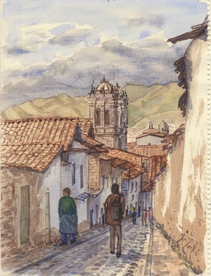 夕方には、空港まで頼んでおいた、ぐたぐたの黄色いビートルタクシーが来る。それまでにと、大急ぎの、2時間ほどでのスケッチ。 サンフランシスコ寺院庭中でスケッチする。赤白のペルー国旗が立っているが、朝のスケッチで描いたものだ。この旗の立つ建物の先隣が、私の泊まっていた 宿だ。