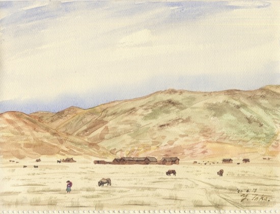 Jamaハマ峠(標高4050m)手前のイミグレーションチェックポストで足止めを食らった。この先の氷雪のために通行止めだという。役人のいる宿舎以外、何もない。スケッチする他にしようがない。塩湖をスケッチする。