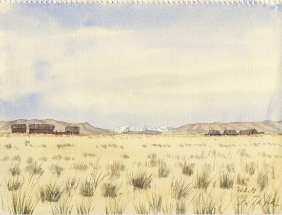 ウユニ塩湖を目指したが、道がわからずに得体の知れぬところを走ってきた。それでもそこに達したようだ。とりあえずスケッチする。陽射しは強くて暖かいと思ったが、陽射しをさえぎると紙面もパレットも凍りつく。空の青の色むらは凍結のせいだ。 塩湖面の蜃気楼のせいで、テーブル状に見える島や対岸の山が縦に伸びたり縮んだりする。遠くの雪山は、海に浮かぶ氷山のように見える。