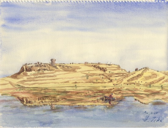 沼に遺跡が写り込んでいる。沼の水中には藻が茂っているが、漁師が網を仕掛けている。 スケッチ終了後、この遺跡に上がって見学した。この向こうには美しい湖水を湛えてウマヨ湖が広がっていた。