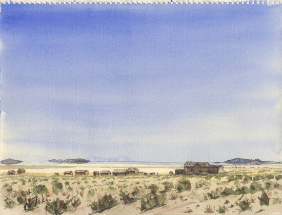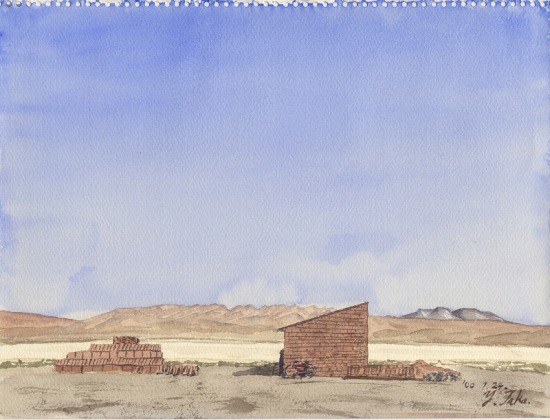 Challapataで昼飯を食って町を出たが、すぐに道端でスケッチを始めた。高地障害からか、下痢が続いており、食後の腹いたわりの期待もあってのことだ。 白く塩が浮いた湖。遠くの山が蜃気楼のせいで浮島に見える。そして、日干し煉瓦の草葺民家。