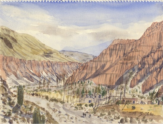 Purmaharcaから西に折れ、チリとの国境を目指す。 道端から寒村をスケッチする。教会と2,3軒の民家。コーラの赤い看板が見える。商店なのだろう。サボテン、そして複雑な侵食面を見せる断崖が見事。 この後、アンデス越しの強烈な向かい風に苦しめられることになる。