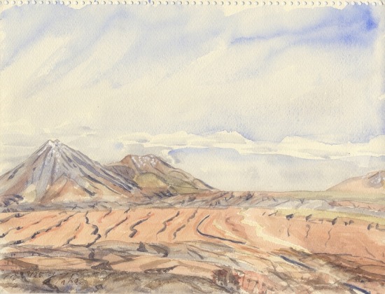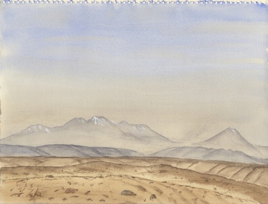 キャンプの朝にスケッチ。日の出前からスケッチを始めた。高所から下ってきて暖かく感じたが、それでも氷点下だったようだ。あっという間に氷結してしまった。太陽待ちであたりを散歩するが、前日スケッチした富士山状の山の陰になって、なかなか陽が昇ってこない。 やっと、陽が差してきて筆を進める。火山があって、噴煙を上げている。しかし、実際はもう一つ左の山だった。紙面を汚してしまったので、そこに煙を描き込むことにした。右手下方にアタカマ盆地が広がっている。これはアタカマ塩湖だったようだ。