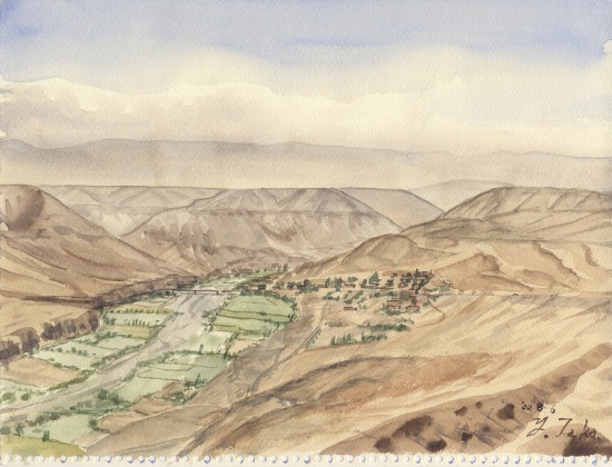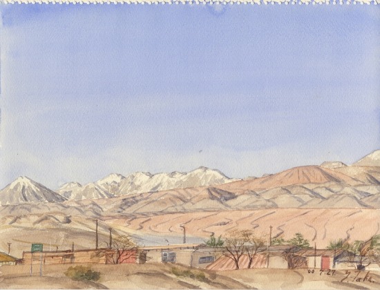 チリ北部からペルー南部の海岸部を走ると、乾ききった平原を進むのだが、太平洋に流れ込む川は深い谷をなし、渡河の度に厳しい登り下りを繰り返す。 川を渡り、延々登ってきて平原が広がると、久々に雪山が望めた。スケッチする。