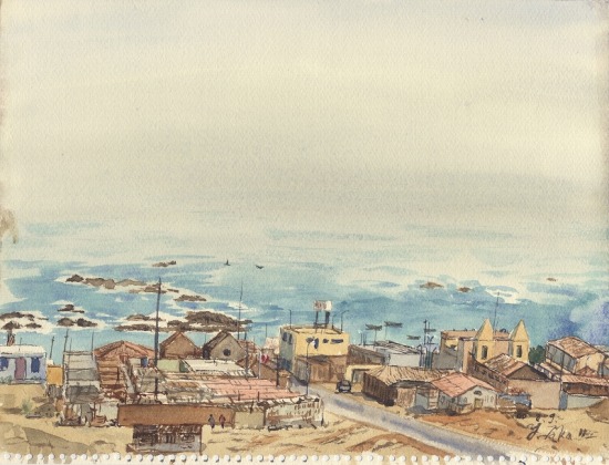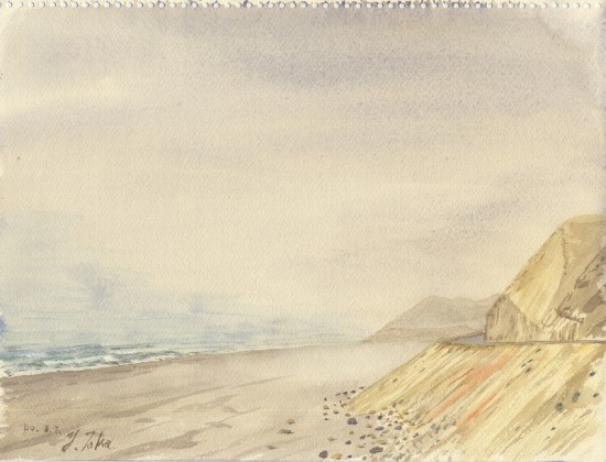 パンナムハイウェーを北上して、チリからペルーに入った。国境を越して程なく、荒野の中に入り込んでスケッチする。海からのもやでかすんでいる。 終了後、そのままキャンプとなった。