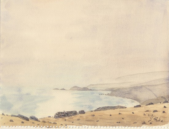 海を見降ろしてキャンプすることにした。まだ3時。スケッチする。 海からのもやがかかってぼやけている。右手には標高千mを越す山地が迫っている。風で波音がかき消される。右手の石積みの囲いには1畳ほどの空間があり、人の生活跡がある。こんなところに居住して、海から何かを採取していたのだろうか?