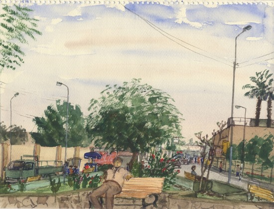 地上絵で有名なナスカ平原近くの町、ナスカ。連泊した宿は居心地が良かった。久々にあったかいシャワーを浴びることができた。夕方、宿近くの小公園でスケッチした。 靴磨き少年のチョッカイがうっとうしい。このスケッチに日付、サインがないのはそのせいだろうか?