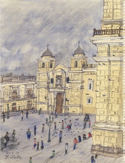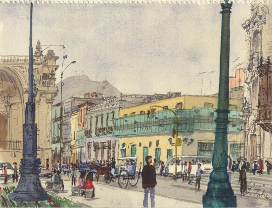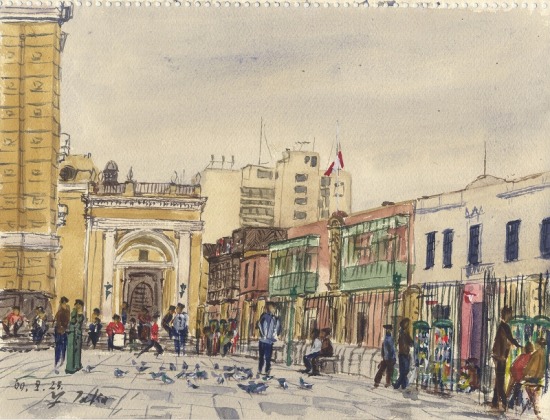 リマセントロのアルマス広場でスケッチする。大聖堂と旧市街の町並みの背後に、サンクリストバルの岡が霞んで見える。 靴磨きの少年達や、みやげ物を立ち売りする娘達に囲まれてのスケッチ。娘達とは一昨日前からの知り合いだ。暇を持て余している彼らの生活苦が思いやられる。