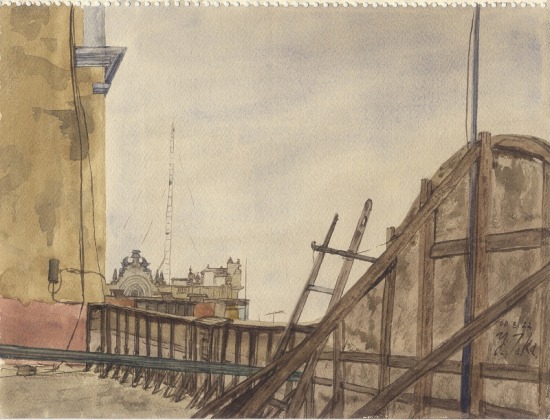 宿の自室で朝食を済ませ、屋上に上がってスケッチする。霧雨が当たるほどで、恐ろしく紙面の乾きが悪い。長い時間、3,4時間ほどか?かけて無事終了。政庁パレスの一部が覗いている。
