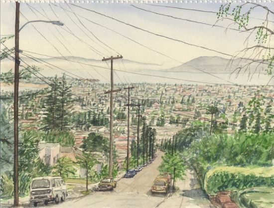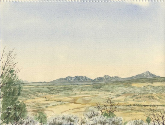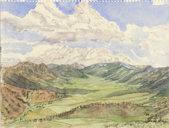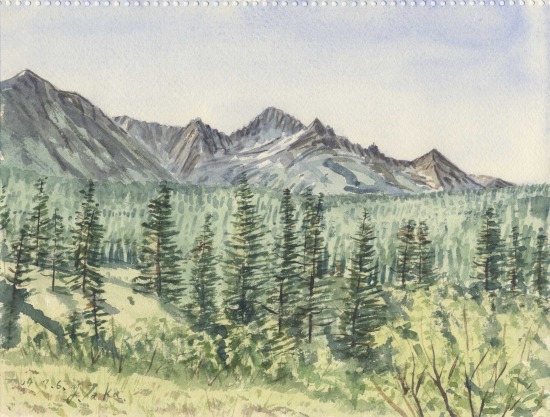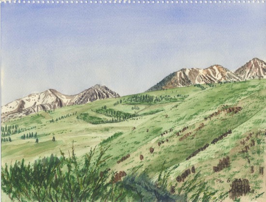 登り道の途中で、午前中のスケッチ。斜面に生える潅木群はアスペンか?そのむこうにシェラネバダの山並み。