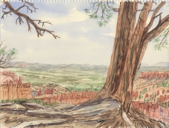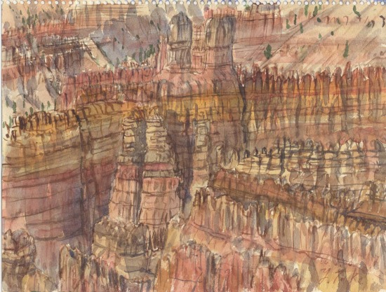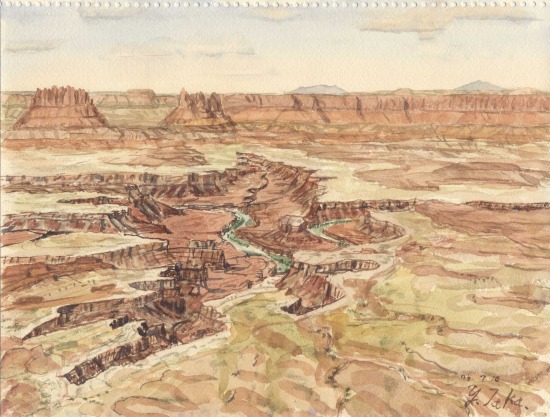朝、ウィローフラットのキャンプ場からGreen River lookoutに歩き下ってスケッチする。白い平地は固い石灰岩の層ゆえに侵食され残ったもので、rimと呼ばれる。ここをえぐる川は、崖に囲まれた深い谷を作る。