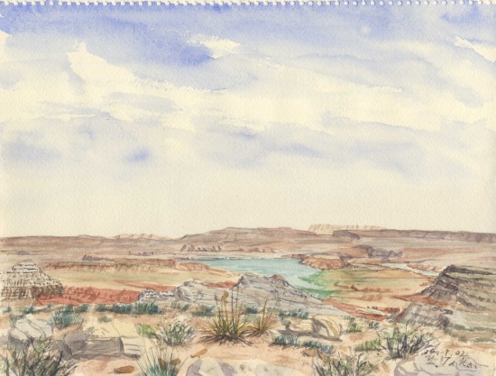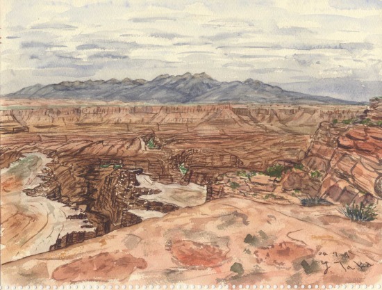 つづら折れの強烈な悪路を上り詰めて高台に上がった。公園内を走る、整備された観光道路のレストエリアでスケッチする。東の方向、Moab方面、コロラド川を見降ろして。