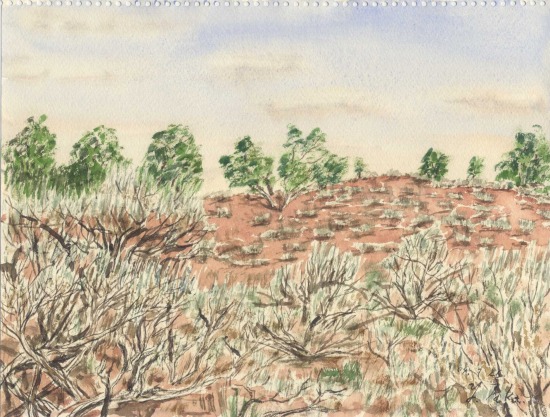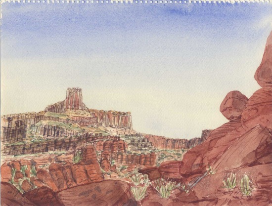 キャンプの朝に。3朝続きのスケッチ。赤茶けた砂岩の色が荒涼感を深める。