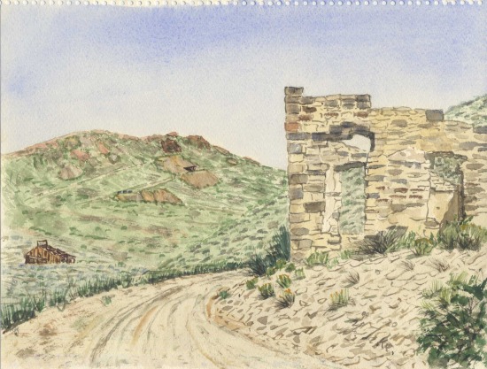 鉱山跡と思われる廃墟にて。打ち捨てられた、トタン屋根小屋にやっと影を求めてのスケッチ。ここ、レイチェルあたりでは、UFOがしばしば見られることで有名だそうだ。