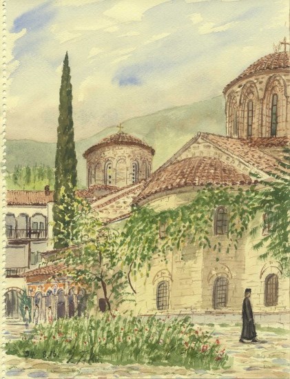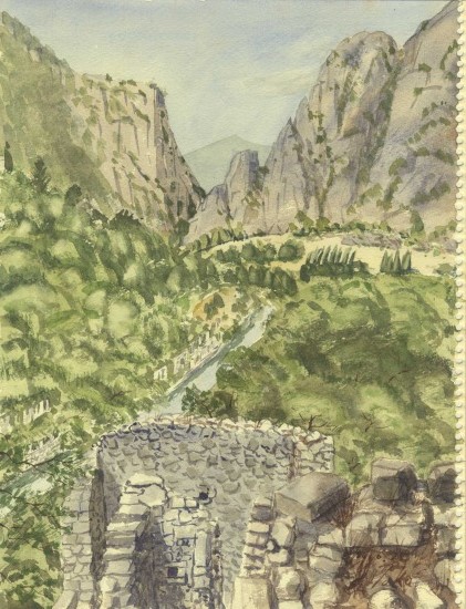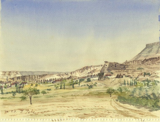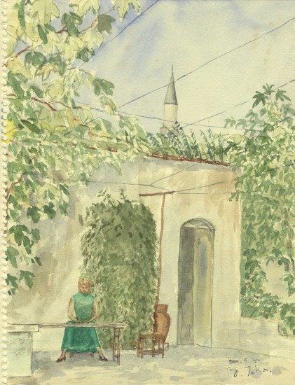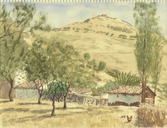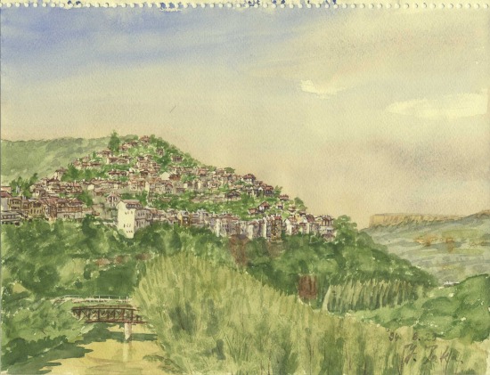 狭くて急な、がたがたの石畳道を上り詰めて、民家の軒下に日陰を求めてスケッチ。住人のおばさんが窓からモモを差し入れ(この場合、差し出しか?)てくれた。早速いただく。みずみずしく、恐ろしくうまい。