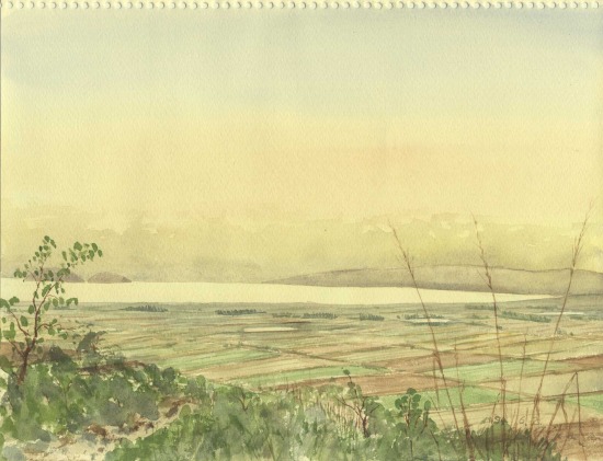 僧院の背後に回り、木柵を乗り越えて草地に入り、座り込んでスケッチする。朝霧がかかって乾きが悪い。紙面の乾き待ちがてら、腹ごしらえをする。そして、スケッチを続ける。