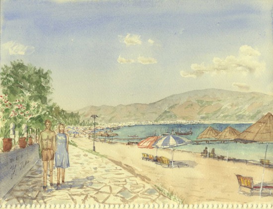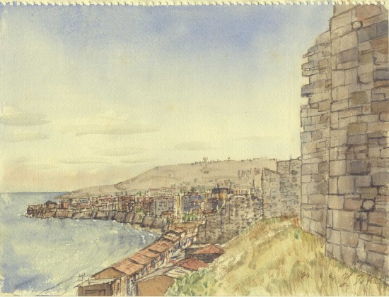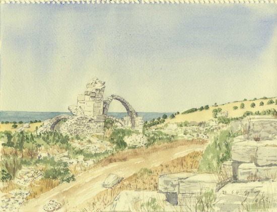 古代遺跡の横の砂浜にあるキャンプ場にテントを張り、早速画材を広げる。夕刻の地中海の中に浮かぶ中世の城郭スケッチ。見物していたキャンパーが、鶏はどこだ、と冷やかす。この城郭の中には鶏が放し飼いにされているらしい。 この城は「乙女の城」と呼ばれているそうだ。王女が殺害されるだろうと予言された王は、王女をこの城に隔離したのだが、結局、陸から持ち込まれたブドウ 籠に潜んだ毒蛇によって、王女は死んでしまった。という伝説があるそうだ。もっとも、陸とつないでいた土手の遺構が海底にあるとか。