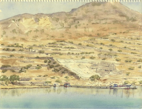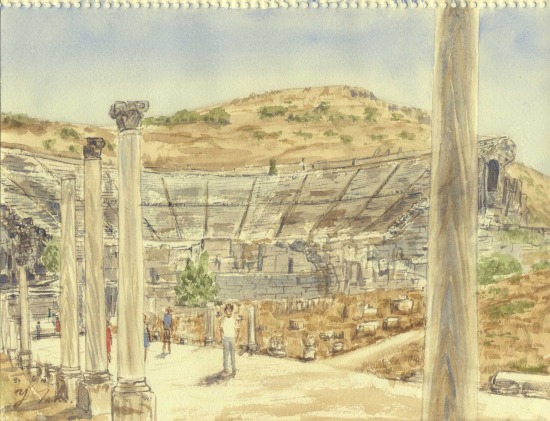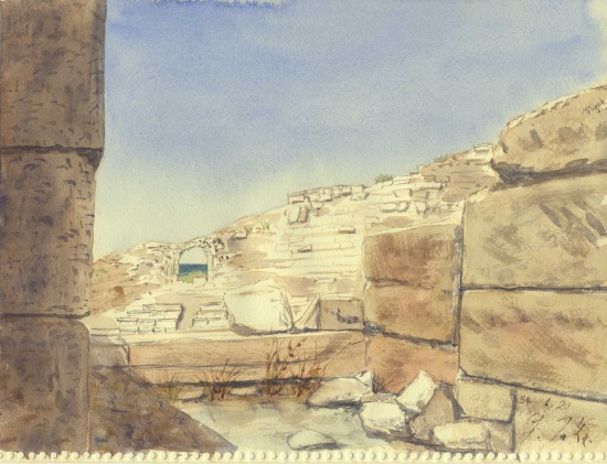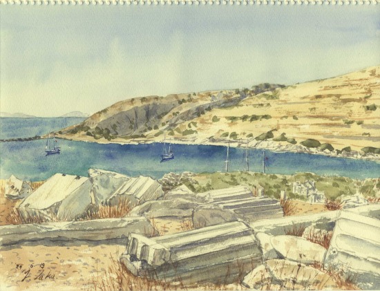 マルマリスから一日極悪路を走って、半島の先端にあるクニドス古代遺跡にやってきた。レストランが一軒あるのみ、宿泊設備はない。浜にテントを張らせてもらい、夜を過ごした。朝に、入り江の対岸からスケッチ。 (この浜でイギリスの1ペニー玉を拾った。これを財布に入れておいた。帰国時、わずかに残った貴重品ポーチの中にこれもあった。今もキーホルダーにつながって、車の鍵紛失防止のお守りとなっている。)