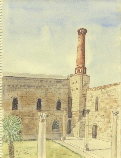 ジャミー(回教寺院)の尖塔をスケッチする。きっと、元はこの上にも塔は続いていたのだろうが、一段目を残して崩れたものと思われる。ここからは見えないが丘の上から覗き降ろすと、この尖塔上には、コウノトリであろう、鳥の巣がある。