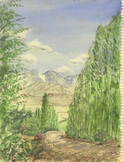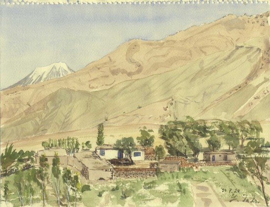 雪渓が白く輝くアイドス山脈。畑から帰るのであろう、家族連れが現れた。母親に言いつけられたようで、男の子がサクランボを持ってきてくれた。この白いサクランボ、スケッチしながら早速いただく。