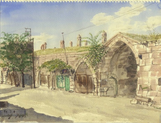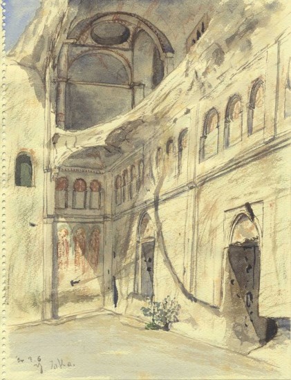 案内された部屋の前でスケッチ。かつての隊商宿、ケルバンサライを改装したホテル。どっしりした石造り、石材むき出しの壁に雰囲気あり。トルコ出国前の贅沢にと、思い切って宿泊。バス、トイレ付きの清潔な部屋、朝食付きで一泊1500円相当。