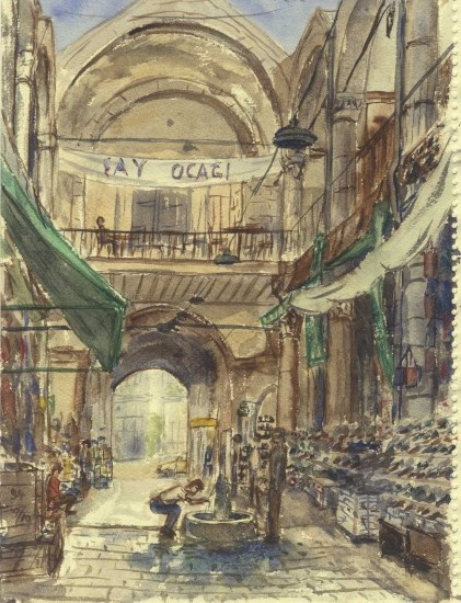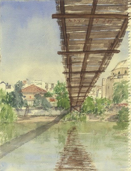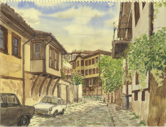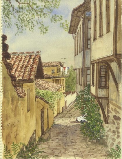 町の名は、サフランの町、を意味する。サフランの産地だったのだろう。美しい木組みを見せる木造家屋群で名高い町。 ささやかな間口の店屋の前に据えられたベンチの片隅を借り、座り込んでスケッチ。やがて人が集まってきて、ヘイゼルナッツやらチャイやら、差し入れが集まってくる。筆を動かすより、口に物を運ぶに忙しい。