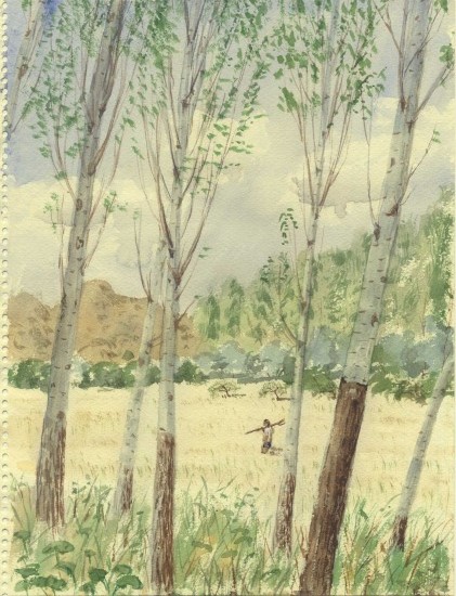 腹を壊してダルく(このあたりは標高2千mほどあり、後から思えば高地障害だったのかもしれない)、林の木陰に入って休む。そして、その場をスケッチ。干草作り作業から帰ると思われる少年が通りかかり、こちらを振り返り振り返り去っていく。