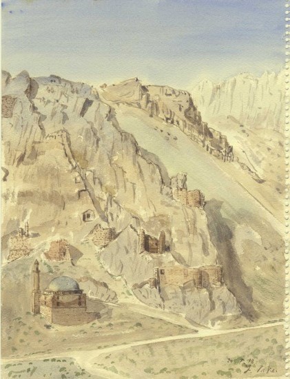 ドウバヤズットから東に登ること5kmほどに、ISHAK PASA SARAI イサクパシャ宮殿がある。それを見下ろす位置に ポツンと一軒のレストランが建っている。食堂の奥の一室に泊まるのだが、レストラン客がいなくなるまで入れないという。それを待つ間にレストラン前からス ケッチする。画面の建物はイサクパシャ宮殿近くのジャミー。 (どうも宿泊は闇営業だったようで、‘95年に泊まりを頼んでも断られた。テントを外に張らせてもらったが、サソリが出るぞ、とか言ってよい顔はしなかった。)