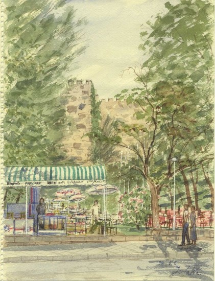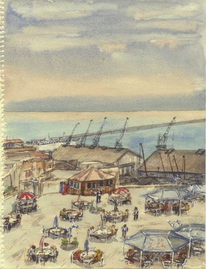 泊まっているホテル、ベンルパレスの部屋から窓外を見下ろして夕刻にスケッチ。港の客船はイスタンブールに行くのか、黒海を渡って旧ソ連諸国に行くのだろうか? 一番近くのテーブルに着いているのは、金髪のロシア女性二人。春をひさいでいるのであろうが客が付かず、いつまでも一杯のチャイで座り込んでいる。