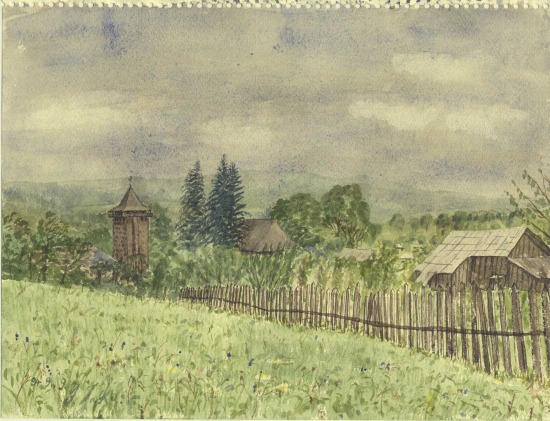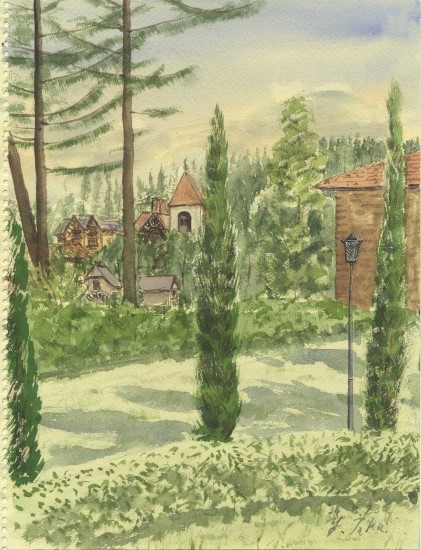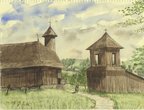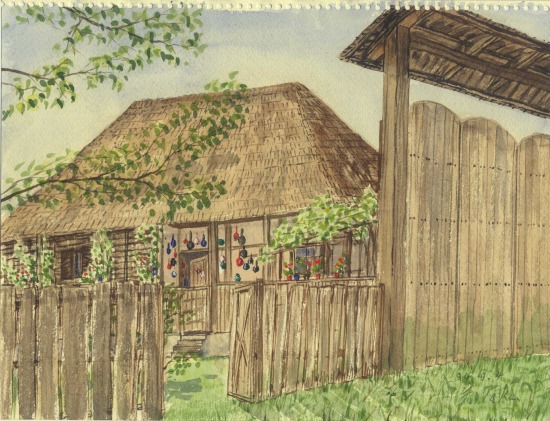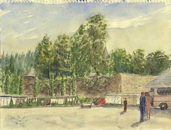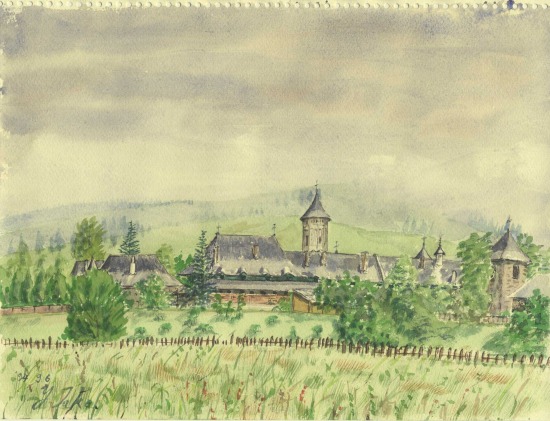 ここMOLDOVA モルダビア地方には多数の高名な僧院がある。僧院は軍事拠点としての意味合いもあったそうだ。高い塀で厳重に守られたこの僧院は要塞のようでもある。 営業してないキャンプ場のバンガロー入り口でスケッチしているのだが、案の定、雨が降ってきた。しかし、終わるころには雨は上がり、また自転車を走らせた。