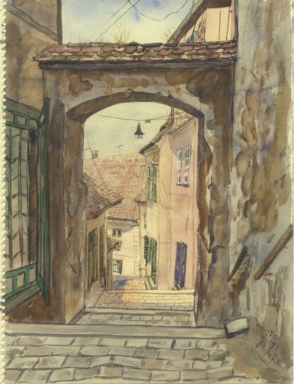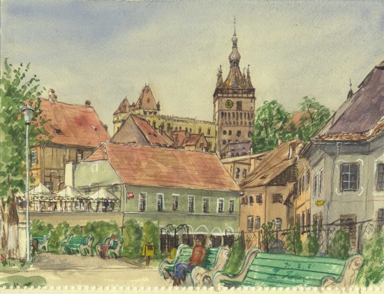 昨日のスケッチで見降ろした辻に座り込んでのスケッチ。正面にゲオルゲアディハウス、その奥に民族博物館と、民族復興期の代表的な豪邸が並んでいる。