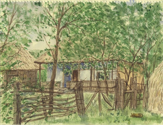 大きな門、板葺きの木造家屋。このあたりの典型的な民家。壁に掛けられた鍋の類が、鉢植えのゼラニュームと美しさを競っている。 プラムの木陰でスケッチしているのだが、見物していた少年がその木から果実を採って、いくつかを私におすそ分けしてくれた。