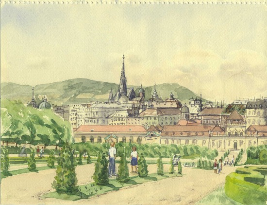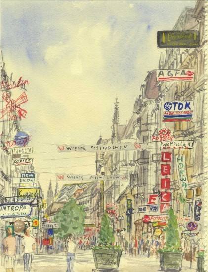 ウィーン一の繁華街。奥にシュテファン大聖堂が見える。左背後にはオペラ座がある。オペラのチケットを売るスタンドの軒下でスケッチしている。チケットを買うのは外国からの旅行者が大半のようだ。