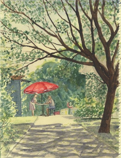 スケッチするそばに二人の子供が張り付いている。昨夏は公園でのスケッチで行儀の悪い子供達に悩まされたが。この二人は酸っぱそうな小ぶりの果実をかじっており、唾を飛ばす。スケッチ画面を汚すので気に障る。結局、終了までいた。3時間も、飽きもせず。