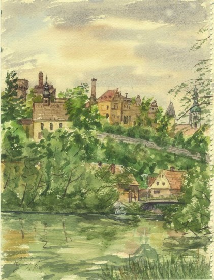 第二次大戦禍をのがれて中世のたたずまいを残す街。川越しにコトノフ城を見上げる。岸辺の柳並木が綿毛を飛ばし、雲のようだ。きまぐれな時雨に悩まされながらのスケッチ。