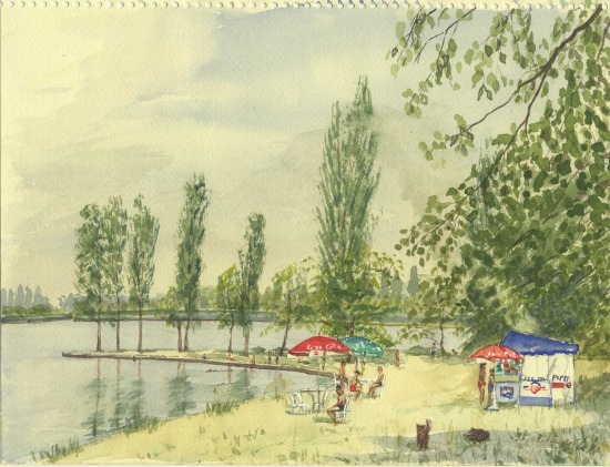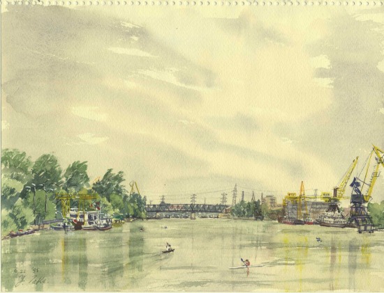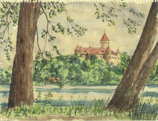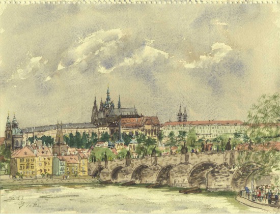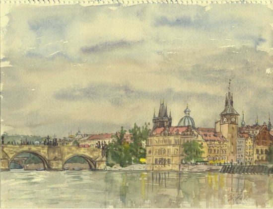 モルダウに浮かぶ中州、射撃島というらしい、の先端からスケッチする。一組のカップルのほかには誰も来ない。しかし、川面に浮かぶ鴨が争って、騒々しく立てる水音に驚かされる。