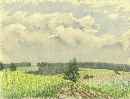 CLUJ-NAPOCAから北上して田舎を目指す。畑の中、土道を登ってきて、峠でスケッチ。遠くの岡斜面の斑点は木立か牛か?スケッチ中の交通量、車1台、馬車1台。