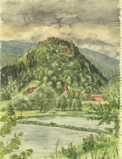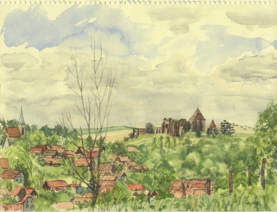 昨年にはスケッチする余裕なく、初秋の夕刻に見上げた、崩れかけた城郭と教会。今回は真夏の真昼に水平位置にながめてスケッチ。