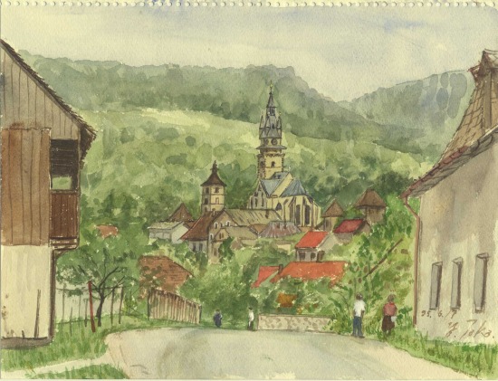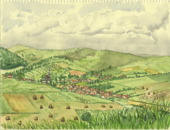 チェコからスロバキアに入って、いきなり暖かくなった。この右下に小さな菜園があって、そこに下る若夫婦と思われる二人に会った。確認を取ると、確かにこ の近くにキャンプ場があるらしい。宿探しの心配なくゆっくりスケッチできそうだ。二人にスケッチブックを見せて、ここまでのスケッチを楽しんでもらう。
