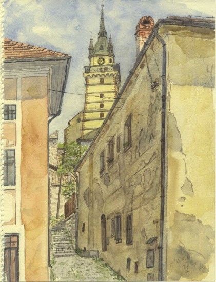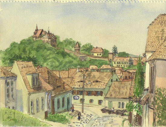 12世紀から開かれて、中世の様子をよく残す街。画面右はずれに、ドラキュラのモデルとなったブラド公の居城がある。