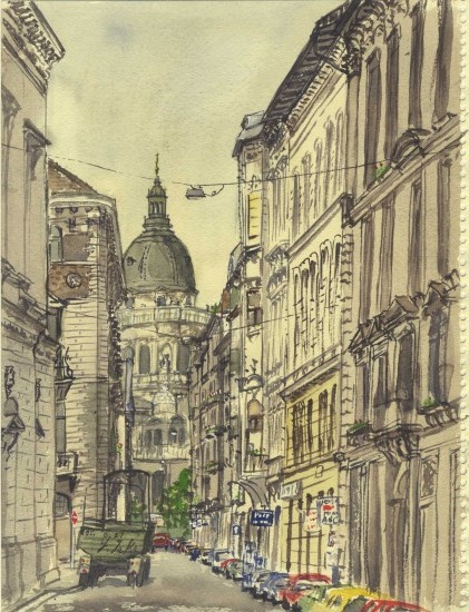 オペラハウス裏でスケッチ。狭苦しく座り心地の悪い窓外に、4時間腰掛けての労作。正面に聖イシュトバーン大聖堂が見える。リハーサルのアリアが響く。