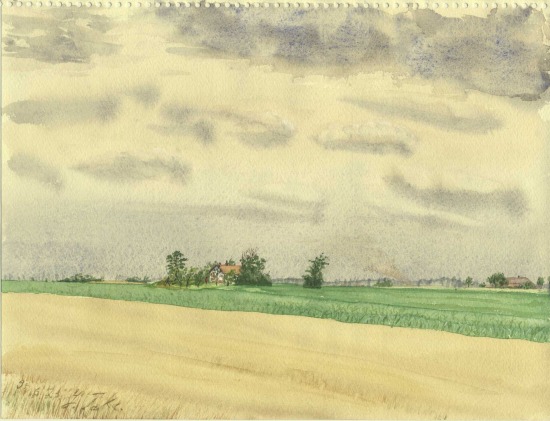 まっ平らな平原で、鉄道の踏み切りに座り込んでやっと見晴らしを得られた。昼時で、まず、朝来た作ってきたサンドイッチで腹ごしらえをして、スケッチに取り掛かる。 手前は麦で、その先は飼料用トウモロコシか?スロバキアでは穂が出て間なしだった麦も、ここでは収穫間近のようだ。