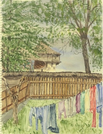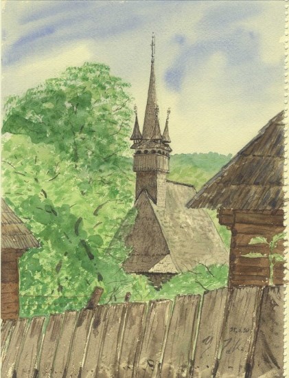 マラムレシュの山奥にあるブデシュチ村。木造教会をスケッチする。民家の門脇を借りているのだが、そこのおばさんが椅子とテーブルを持ってきてくれた。 その上、足元に茂るイラクサをむしってくれる。この毒草、見た目は日本の水辺でよく見る草そっくりなのだが、触れるとイラ毛虫に刺されたような感じにな る。おかげで快適にスケッチできた。