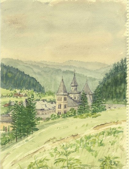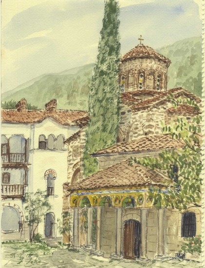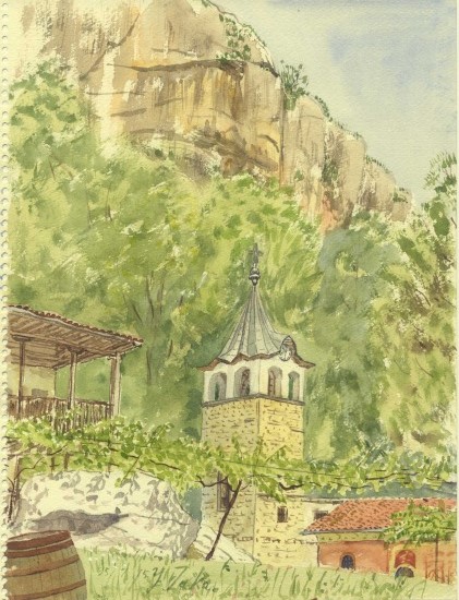 ベリコタルノボ郊外、静けさの中に取り残されたささやかな僧院。昨夏、案内道路標識に誘われて何気なく訪れた。スケッチはしなかったが強い印象を覚えた僧院。幹線から、昨年は心細さを感じたほどの森の中の細い山道を登って、朝にやってきてスケッチを始めた。