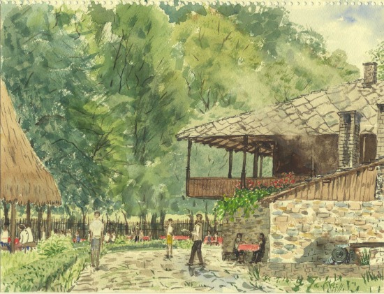 ガブロボは職人の町として知られ、この博物館では、18,19世紀さながらの職人技を実地に見られ、産物も買える。 石釜で薪を焚いてパンを焼いたり、炭火でケバプチェ(細長いミートボール、ルーマニアではミッチ)を焼いたり、の煙が上がっている。もちろんスケッチ後にこのケバプチェを買い食いした。塩味はきつかったがおいしくいただいた。
