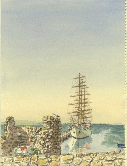 夏シーズン真っ盛りで、この小さな町は観光避暑客でにぎわっている。眼下の、遺跡を利用したレストランもまずまずの入りだ。係留された帆船は、イスタンブールとの定期観光航海に就くのだろう。