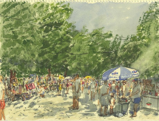 絵描きや土産物屋が商売に励んでいる。右手前の黒い装置は手回し自動ピアノで、時折、能の無い大道芸人が演奏する(ハンドルを回すだけ)。その音色は調子っぱずれなのだ。