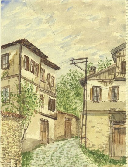 トルコ伝統大型木造建築で有名な町。その昔、このあたりにサフランが群生していたことから町の名がついたそうだ。 朝に街に入り、早速スケッチする。