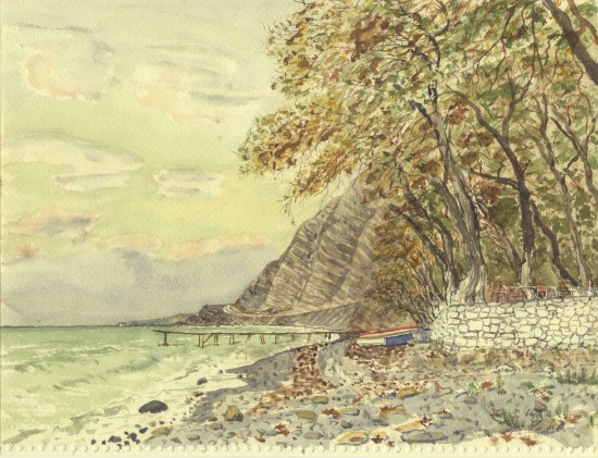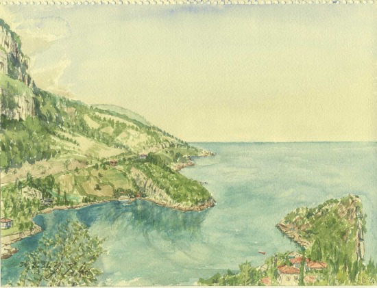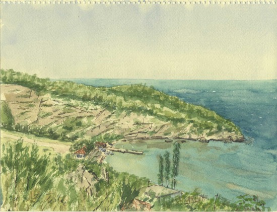 スケッチ終了後、画面にある海辺のレストランに下った。家主の家族と一緒に同じものを食べた。じっさまが、ヤマハの船外機のついた自慢のボートに誘って くれた。入り江を出ると、黒海の波は荒くてすぐに戻ったのだが。庭先の果樹脇にテントを張らせてもらい、夜を過ごした。
